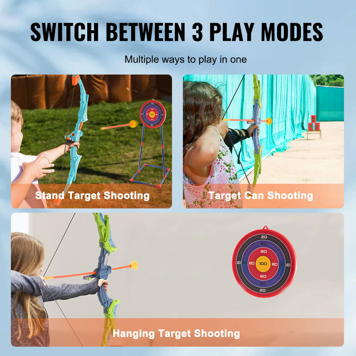 Comprehensive Entertainment Solution: Made with top-quality, durable materials, our kids bow and arrow set is built to last through all your outdoor adventures. Inside, you'll find 2 bows with cool lights, 20 arrows, 2 quivers, 1 standing target, and 3 target cans. It's all about endless laughs and good times, perfect for every family outing! (Batteries not included.)