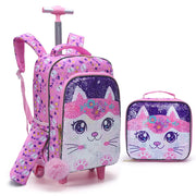 Rolling Backpack For Girls, Cute Cartoon Cat Sequin Bookbag