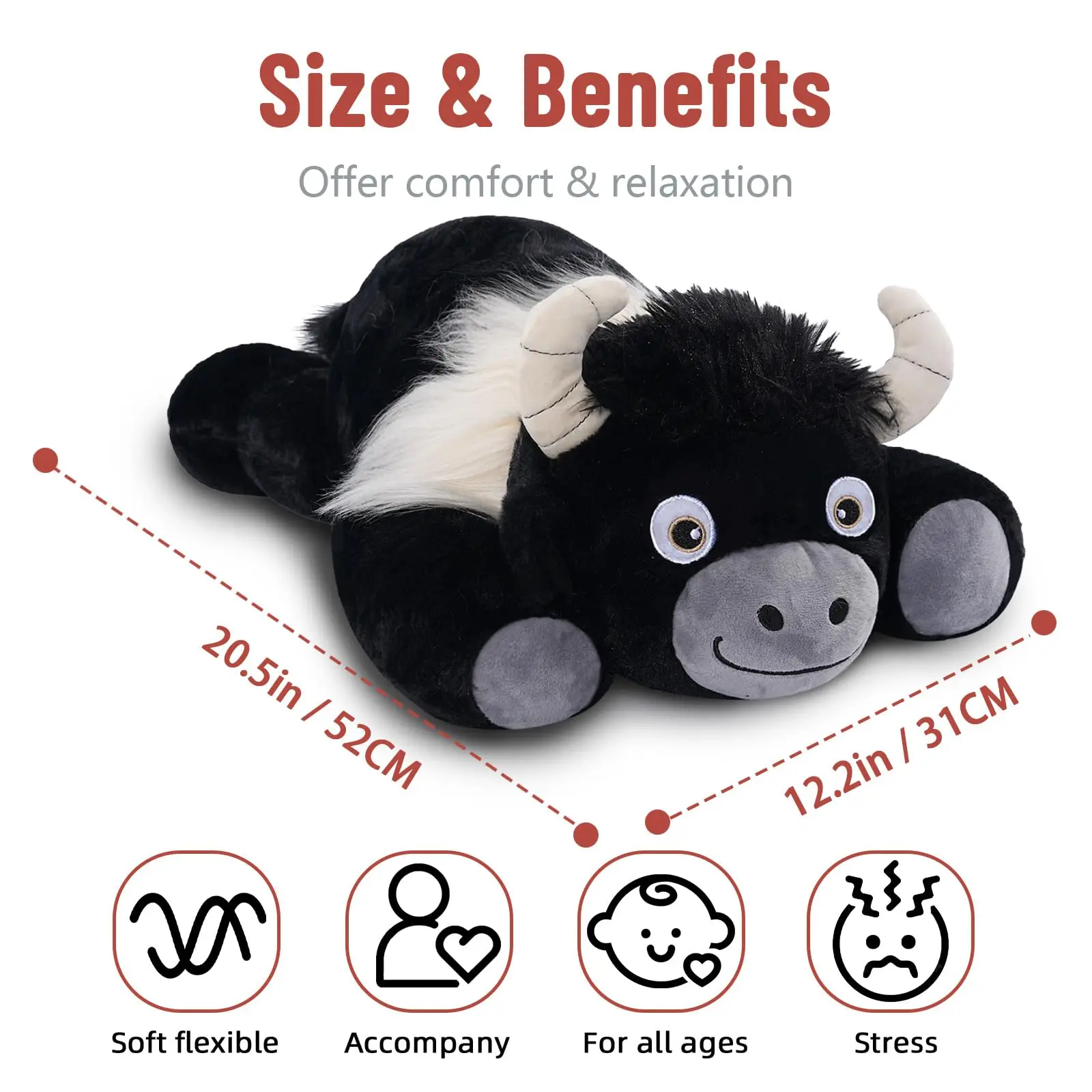 Sensory Experience : Niuniu Daddy Weighted Highland Cow Body Pillows provides a soothing sensory experience. Offers 3.3lb weights to help calm irritability. This Pillowfort Weighted Plush Animals helps manage stress and its body size is great for cuddling